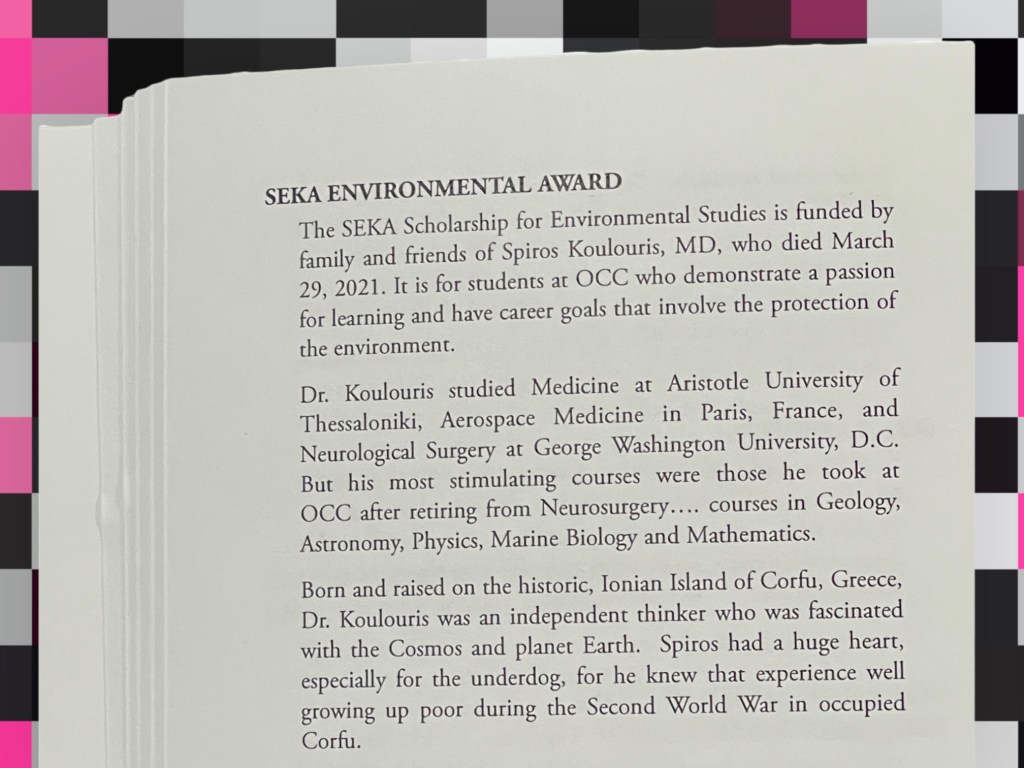 The 65th Annual Orange Coast College Honors Night was also the first for SEKA. In memory of Spiros Koulouris, who died on March 29, 2021, Elizabeth Koulouris awarded Yu Yu (Yvonne) Hlaing the inaugural SEKA, Spiros and Elizabeth Koulouris Award.